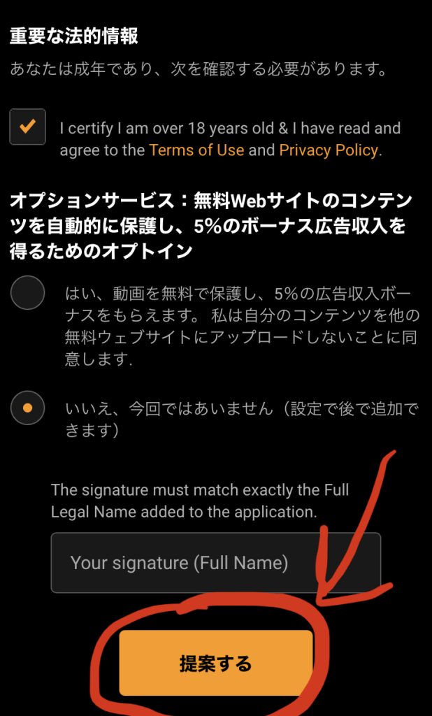ここで下のような画面になりますのでPornhub規約に同意するかどうか聞かれますのでチェックを入れていきます。